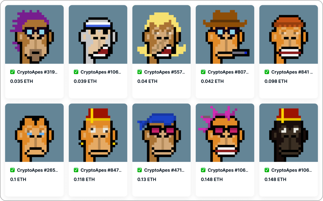CryptoApesは、猿をモチーフとしたNFTコレクションです。大人気NFTコレクションの「Bored Ape Yacht Club(BAYC)」から派生したNFTのひとつと考えられます。