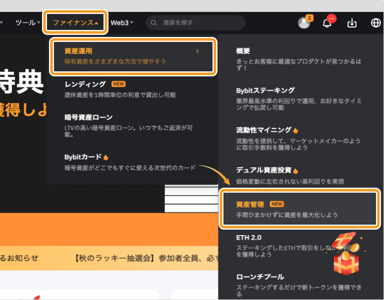 Bybit(バイビット)資産管理とは、仮想通貨(暗号資産)を預け入れて利息を受け取れるサービスです。