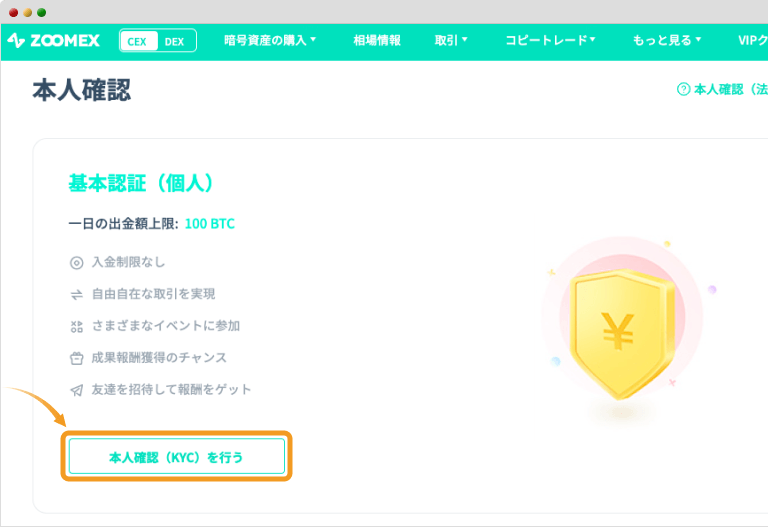 Zoomexでは、一般的な仮想通貨(暗号資産)の取引を行うだけなら、本人確認手続きは不要です。実際、ZoomexではKYCをしなくても、大きく機能面が制限されることはありません。