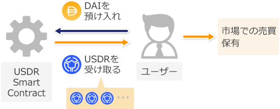 ユーザーがスマートコントラクトを介して、DAIを入金すると、同等のUSDRが付与されます。USDRを償還する際には、その逆のプロセスでDAIが返金されます。