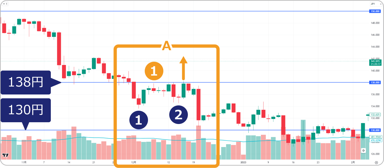 Aの場面では、ドル円が138円を下回って安値①を作った後、出来高は20日平均付近を維持しながら陽線を形成しました。新たな安値②を作った際に、安値切り上げ型のWボトムから高値①をブレイクアウトすることを想定して、高値①に買い、安値②に損切りの逆指値注文を入れます。