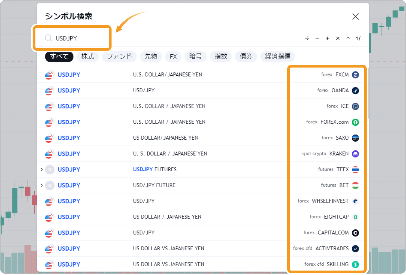 例えば、シンボル検索欄に「USDJPY」を入力するとレートの提供元が一覧で表示されます。