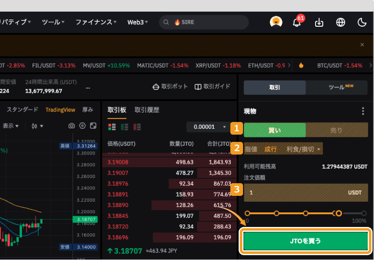 まずは以下のリンクをクリックし、JTOの購入ページ(JTO/USDT)にアクセスします。