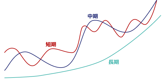 3種類のトレンドとは長期・中期・短期のトレンドを指し、通常、長期トレンドは1年~数年間、中期トレンドは3週~3ヶ月間、短期トレンドは数時間~3週間未満に分類されています。