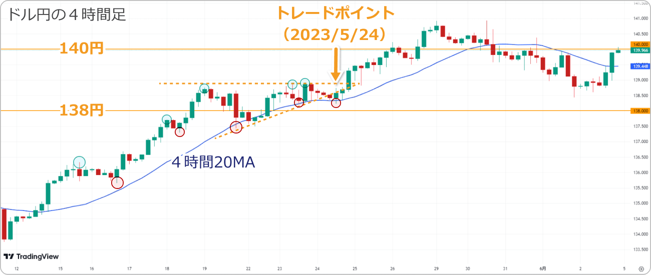 上向いた20期間の移動平均線(MA)が日足の上昇モメンタムの高さを示しています。デイトレードでの利益確定の目安は、過去に売買が交錯しているキリ番の140~142円付近の価格帯です。