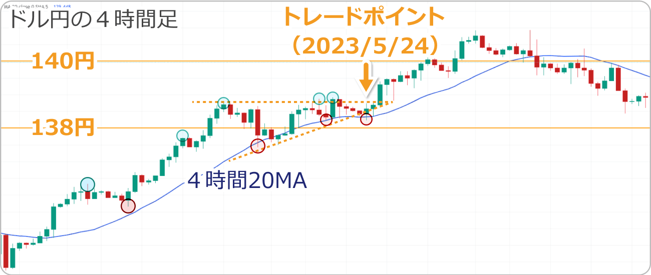 上向いた移動平均線(20期間)で反発したことからグランビルの法則の買いサインに該当します。高値更新とともに、4時間20MAからの乖離を大きくして上昇することが見込まれる局面です。