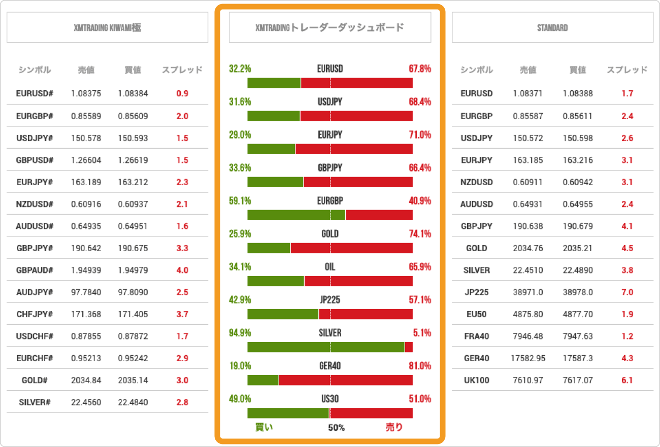 またポジション比率の左右には、各通貨の現在の価格とスプレッドの一覧が表示されており、為替市場全体の流れも把握可能です。