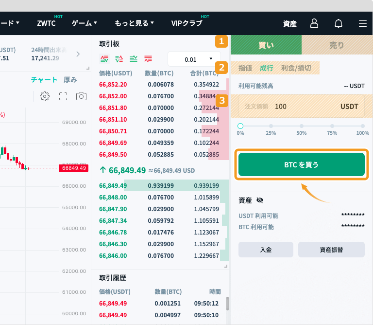 注文する価格を入力します。注文価格は取引板をクリックして選ぶこともできます。注文価格はデフォルトで入っている仕様なので、そのまま注文に進むことも可能です。 |