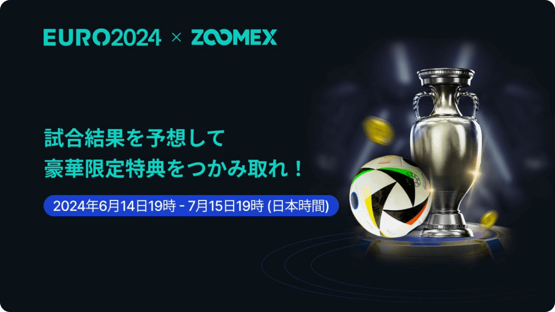 2024年6月14日、海外取引所のZoomex(ズーメックス)が、ヨーロッパのサッカー大会「EURO2024」の予想キャンペーンを開催しました。EURO2024の試合結果を的中させたり、キャンペーン期間中に入金・取引をしたりすると、様々な特典の獲得チャンスがあります。