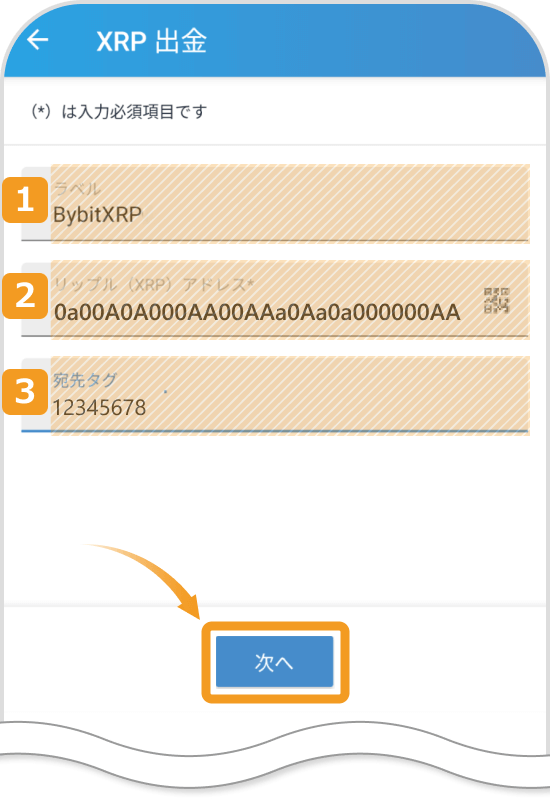 送金先の宛先タグを入力します。今回の場合、手順6で表示させたBybitの「Tag/Memo」を入力します。 |