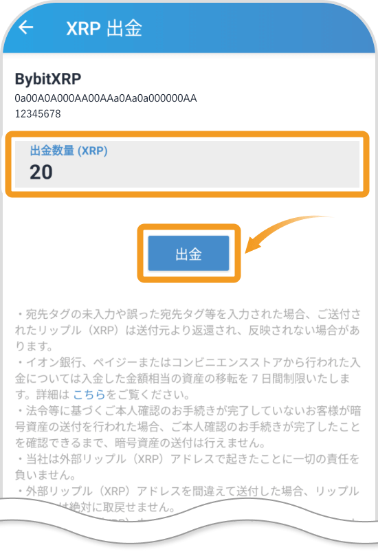 今回は20 XRPを送るため、「20」と入力して「出金」をタップします。